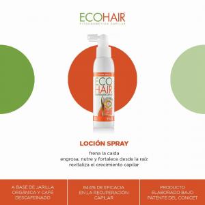 La Loción Spray ECOHAIR está hecha a base de jarilla orgánica y café descafeinado orgánico. Tiene una triple acción sobre el cabello: frena la caída, nutre y fortalece desde la raíz y revitaliza el crecimiento capilar.